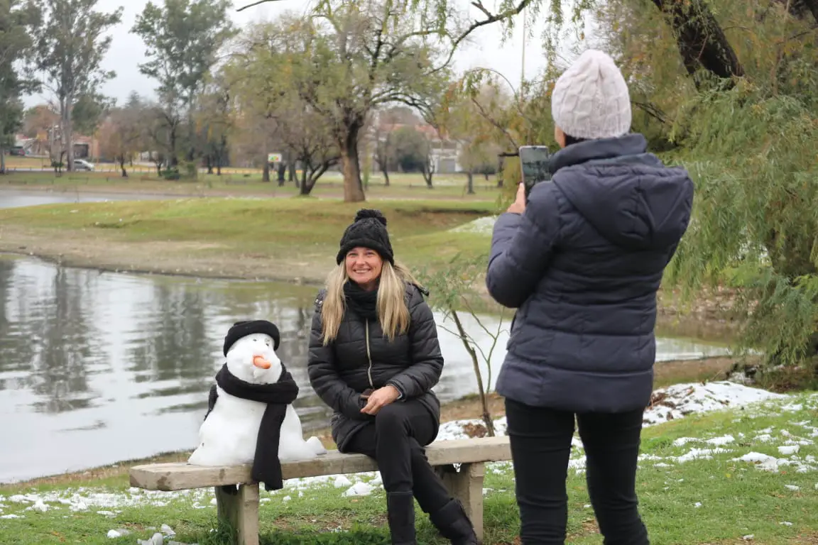 Está solito, sentado en un banco en la Bahía del Gitano. Y este miércoles en que Carlos Paz y buena parte de Córdoba amanecieron nevados, se convirtió en el protagonista de todas las fotos y selfies en la Costanera de Carlos Paz.