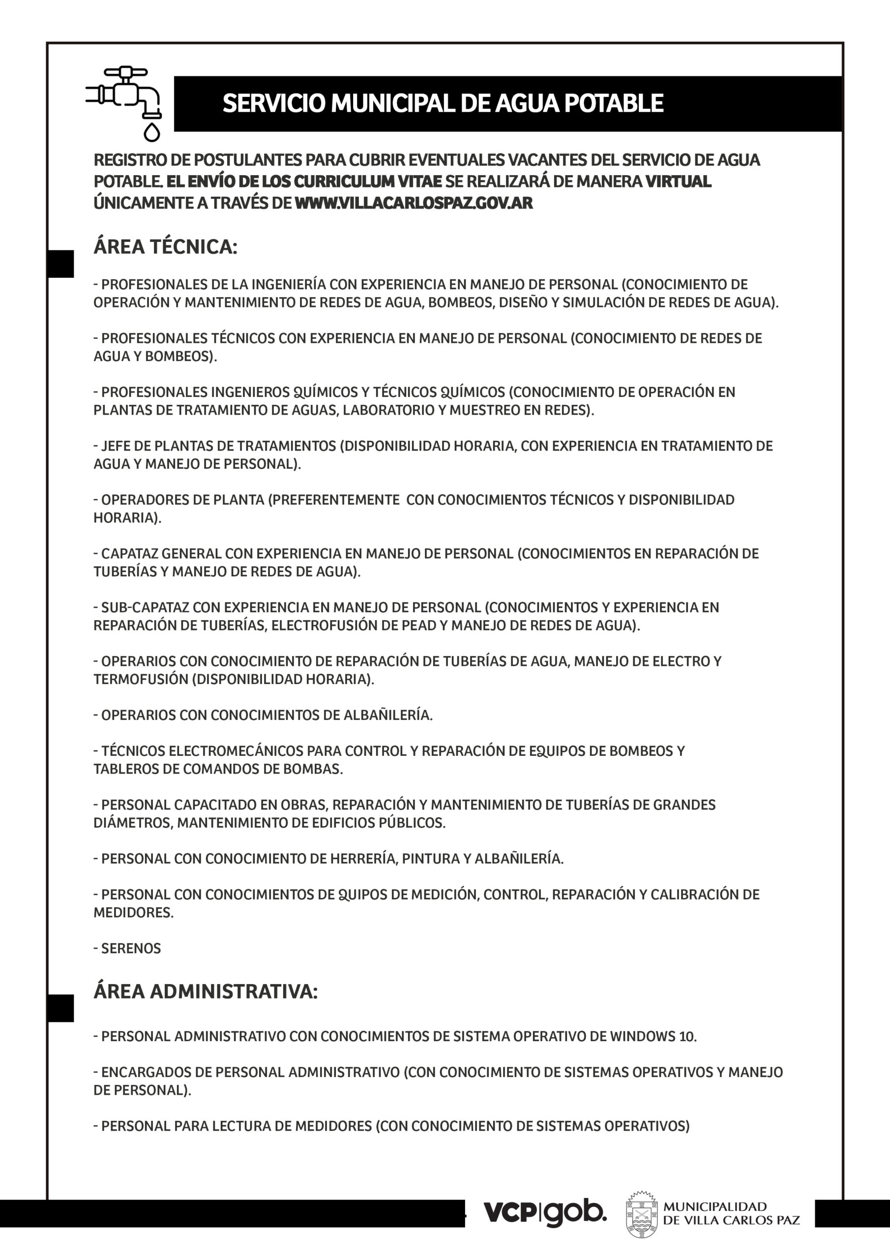 Se piden profesionales para las áreas técnicas como ingenieros con experiencias en el manejo de personal, profesionales técnicos químicos, jefes de plantas de tratamietno, operadores de planta, operarios con conocimiento en reparación de redes y tuberías de agua, entre otros.