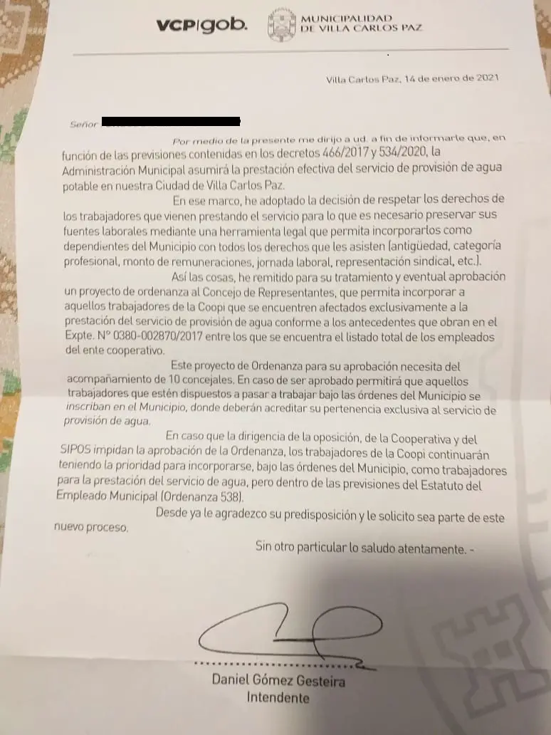 En esta semana, los empleados de la cooperativa están recibiendo una carta con la firma del intendente en la que el planteo es similar al que hoy se conoció a través de la conferencia de prensa.