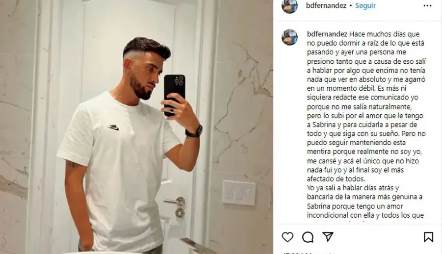 “Estuve resguardado unos días para no generar más repercusiones de las que ya habían. Pero dado que esto viene incrementándose y el nivel de agresión para con Sabri escaló demasiado, me veo en la obligación de salir a aclarar este tema”, reza el posteo que Fernández hizo en su cuenta de Instagram.