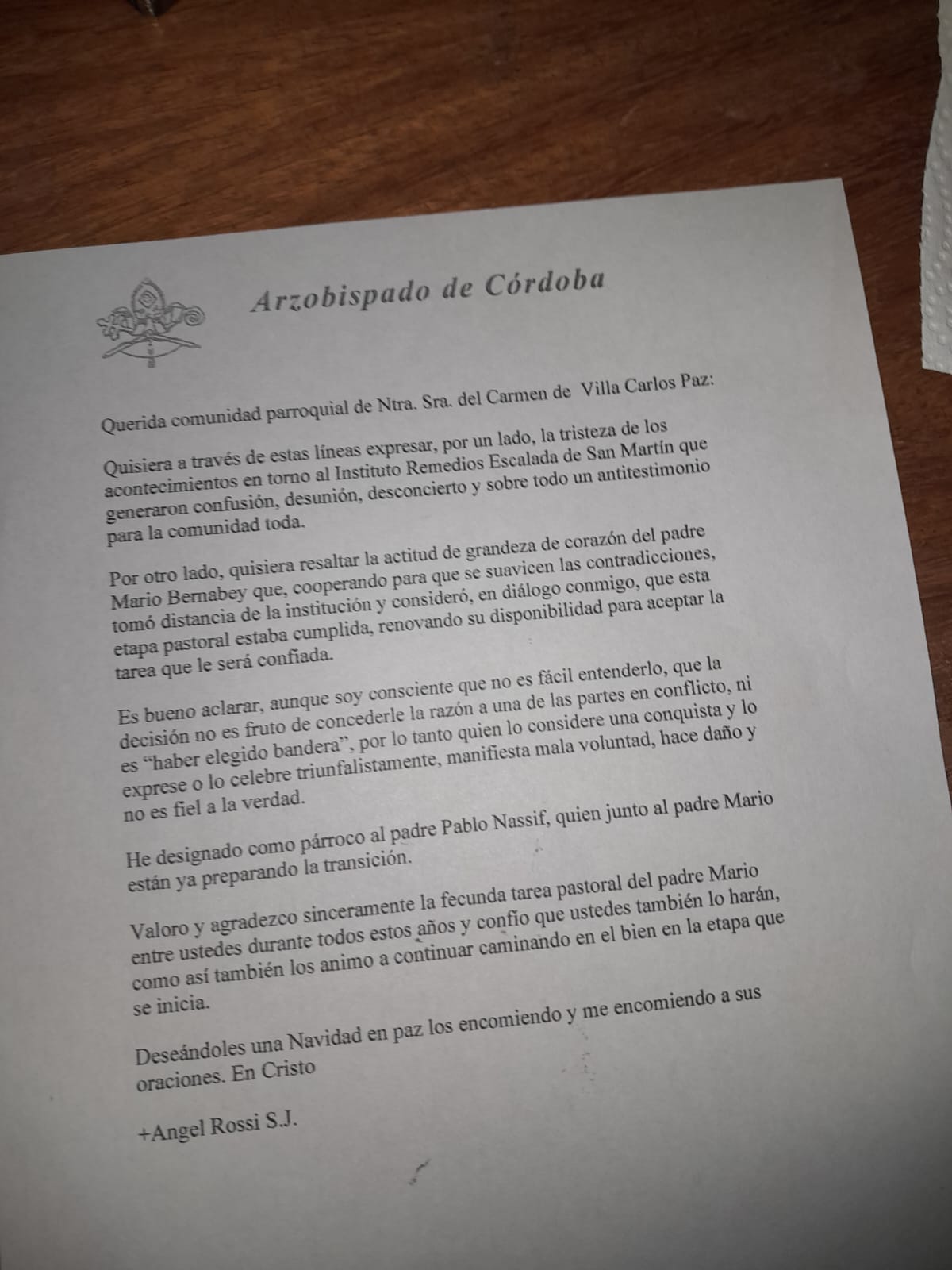 En otro párrafo del documento al que tuvo acceso Carlos Paz Vivo, expresó que se designó al padre Pablo Nassif como párroco de la Iglesia del Carmen que ya está trabajando con el padre Bernabey para la transición.