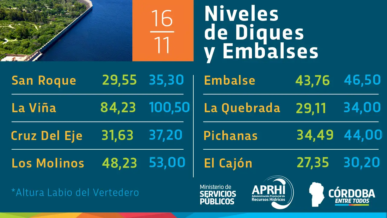 El dique que mas aumentó su nivel entre el viernes y este lunes es La Viña cuyo incremento fue de 50 centímetros pero aún se encuentra a 16,27 metros del vertedero.