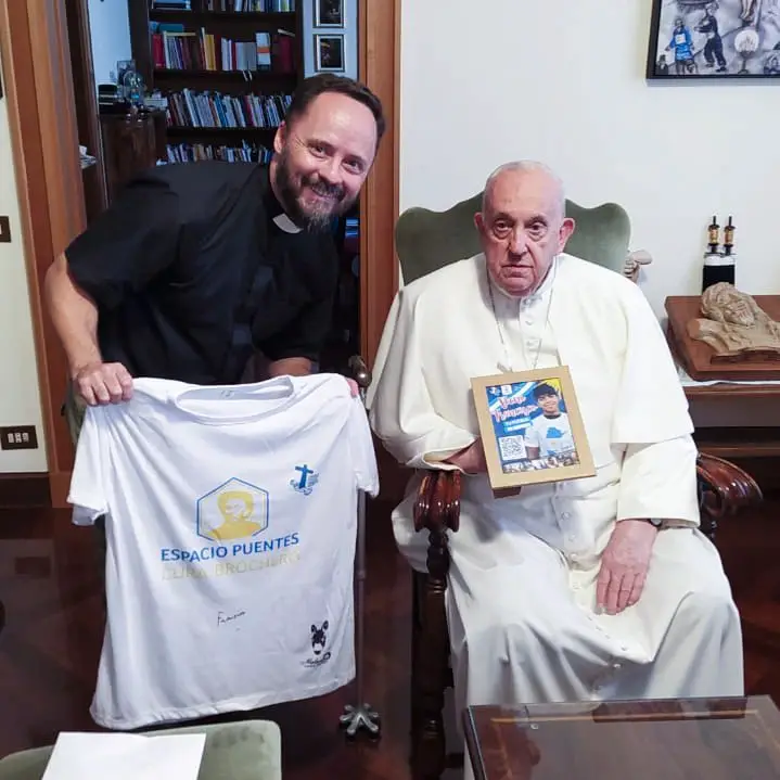 “Sentí que fue un encuentro de un nieto con su abuelo, todo tan natural, él es muy llano… Hablamos de la diócesis, el Papa contó anécdotas, me regaló pila de libros, rosarios, estampitas… hicimos el intercambio de remeras (le llevé una del Espacio Puentes – Hogar de Cristo Cura Brochero) y le di el cuadro… vimos el videoclip, le gustó mucho y ahí el Papa dijo ‘tengo ganas de ir a la Argentina’. ¡Misión cumplida, Familia!”, expresó el sacerdote en un video que compartió con la Familia Grande Hogar de Cristo, de la cual es parte integrante.