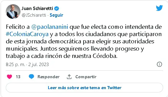 “Felicitaciones Paola Nanini, flamante intendenta electa de Colonia Caroya! Extiendo mi saludo a los demás candidatos y a los vecinos de esta pujante localidad que vivieron un domingo de elecciones y compromiso cívico. Con Paola trabajaremos juntos por el progreso de la región”, expresó Martín Llaryora.