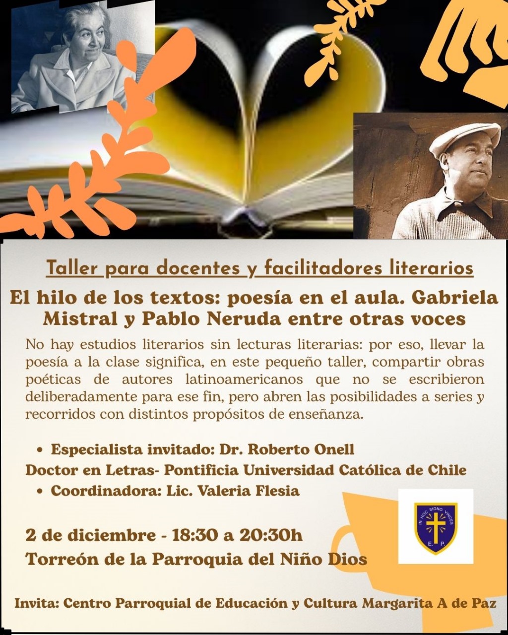 El Taller se centrará en la poesía chilena de autores como Gabriela Mistral y Pablo Neruda y, al decir de Onell, “realizaremos un ejercicio de conversación con obras que guardan algo para uno y en uno”. Ambas actividades son absolutamente gratuitas.