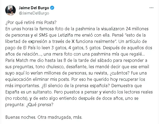 En unas horas la famosa foto de la pashmina la visualizaron 24 millones de personas y el SMS que Letiziña me envió con ella. Pensé “esto de la libertad de expresión a través de X funciona realmente”. Un artículo de pago de El País lo leen 3 gatos, 4…— Jaime Del Burgo (@JaimeDelBurgo) December 27, 2023
