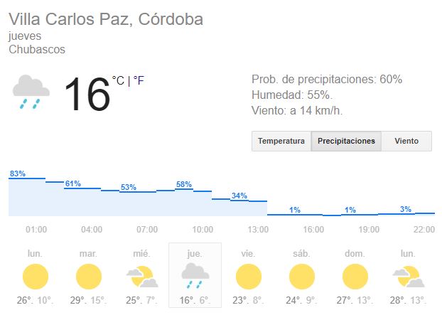 Desde hace varios días las páginas webs especializadas en clima anuncian lluvias en la región para el jueves 21 de septiembre, Día de la Primavera y del Estudiante. Pese a ello, desde la organización de la fiesta que se realizará en Carlos Paz confían en que el tiempo mejorará hacia el mediodía y no cancelarán ningún show.