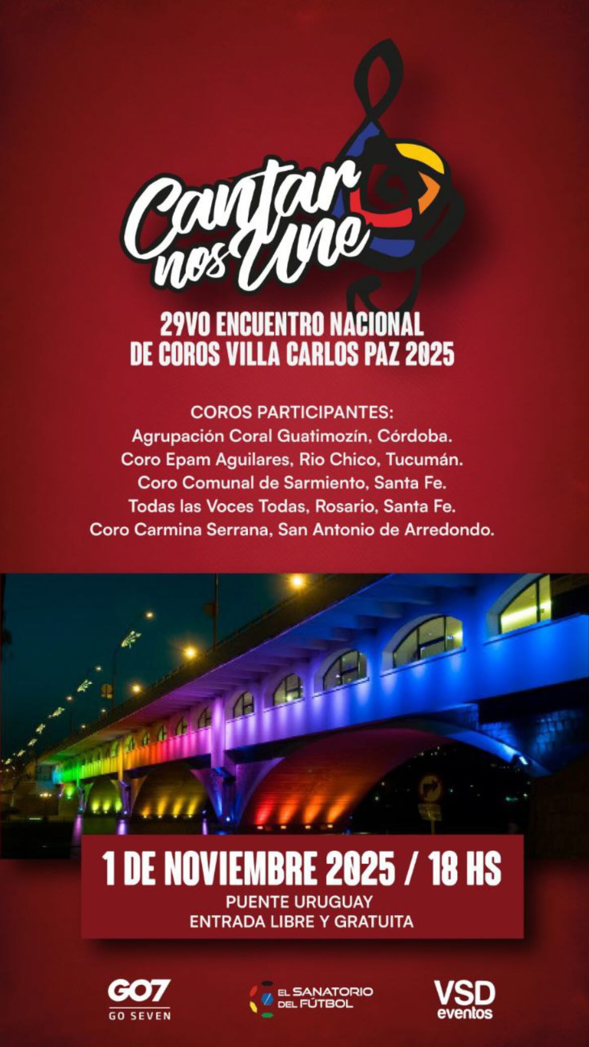 Villa Carlos Paz volverá a llenarse de voces y armonías con una nueva edición del Encuentro Nacional de Coros “Cantar nos une”, que celebrará su 29° edición el próximo sábado 1 de noviembre, a partir de las 18 horas, en el Puente Uruguay.
