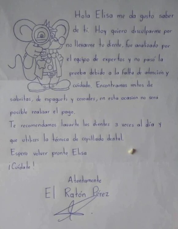 El “Ratón Pérez”, aquel personaje que en otros lugares del mundo es conocido como “el hada de los dientes” y que entrega dinero a los niños a cambio de sus dientes de leche, no dejó ninguna moneda ni billete pero escribió una carta.