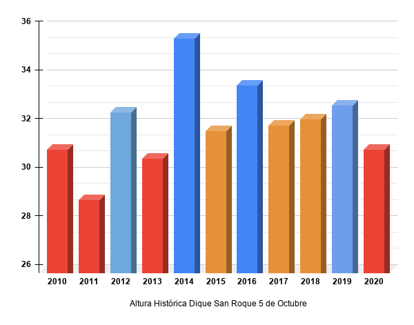 Por ejemplo, el 5 de octubre de 2011, la altura del espejo de agua en el paredón del Dique era de sólo 28,88 metros y se encontraba 6,42 metros por debajo del nivel del vertedero (35,30 m.). El 5 de octubre de 2013 registró 30,58 metros, 4,72 metros por debajo del embudo y, este 5 de octubre de 2020, la altura de lago fue de 30,94 metros, o sea a 4,36 metros del embudo.