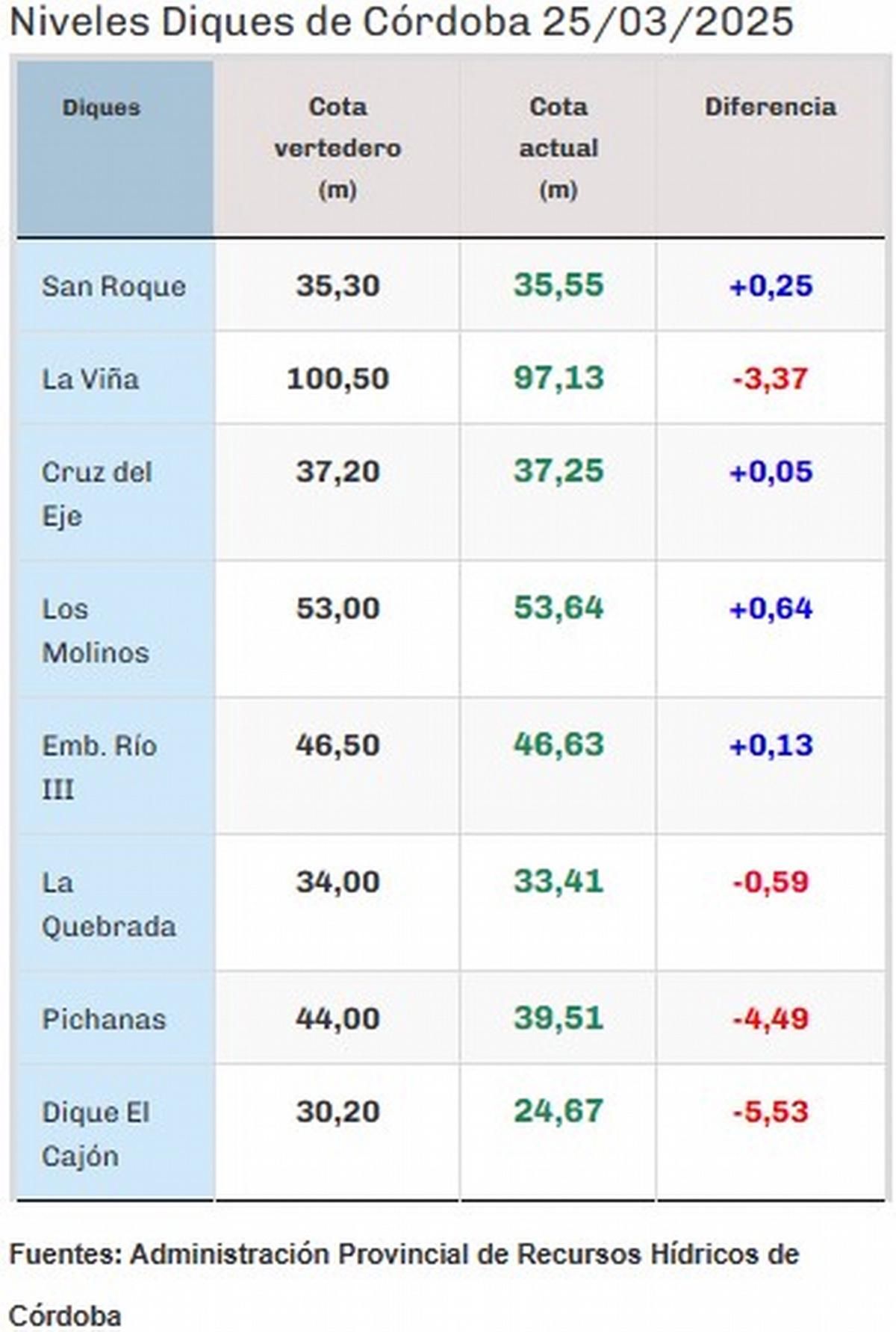 Otros embalses, como Los Molinos, Río Tercero y Cruz del Eje, también han alcanzado sus niveles máximos en las últimas semanas, mientras que La Quebrada, en Sierras Chicas, se encuentra a pocos centímetros de hacerlo. «Arrancó en noviembre diez metros por debajo y, con estas lloviznas permanentes, se recuperó lentamente», detalló el funcionario.