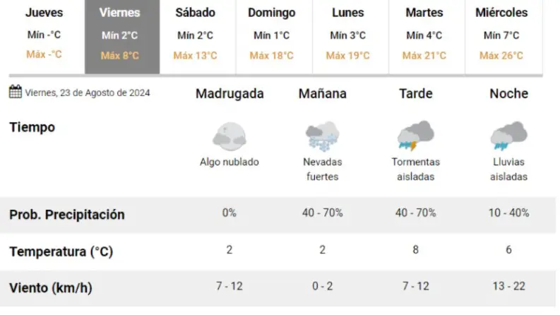 El informe del SMN señala que «el área será afectada por nevadas de variada intensidad, con algunas precipitaciones localmente fuertes.» Se estima que la acumulación de nieve podría alcanzar entre 5 y 10 centímetros, con la posibilidad de superar estos valores en algunos sectores. En las zonas más bajas, las precipitaciones podrían alternar entre lluvia, nieve mezclada y aguanieve.