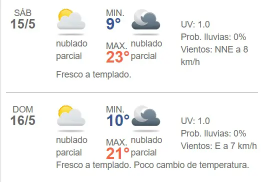 En tanto, las condiciones meteorológicas para el domingo serán similares. Con una mínima de 10°C y una máxima de 21°C, el fin de semana cerrará con un día agradable, con cierta nubosidad durante la jornada; aunque también con un poco de sol.