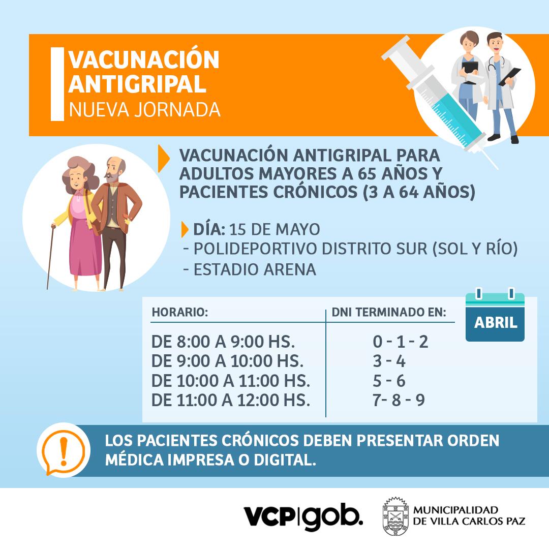 La Secretaría de Salud Pública del municipio de Villa Carlos Paz realizará este viernes 15 de mayo una nueva jornada de vacunación antigripal.