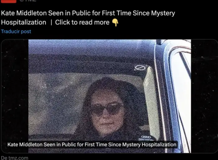 En cuanto al hecho, Kate fue vista trasladándose en un Audi, sin escoltas. Ella iba de copiloto y su madre manejaba. Llevaba su cabello liso, grandes gafas de sol que escondían su rostro, un abrigo oscuro cerrado hasta arriba y mostraba un aspecto sereno.
