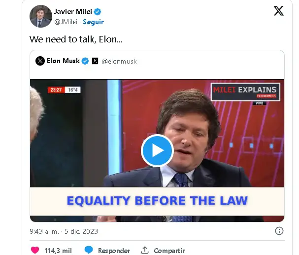 “We need to talk, Elon”, escribió el líder de La Libertad Avanza contestando a una publicación de Musk en la red social antes conocida como Twitter.
