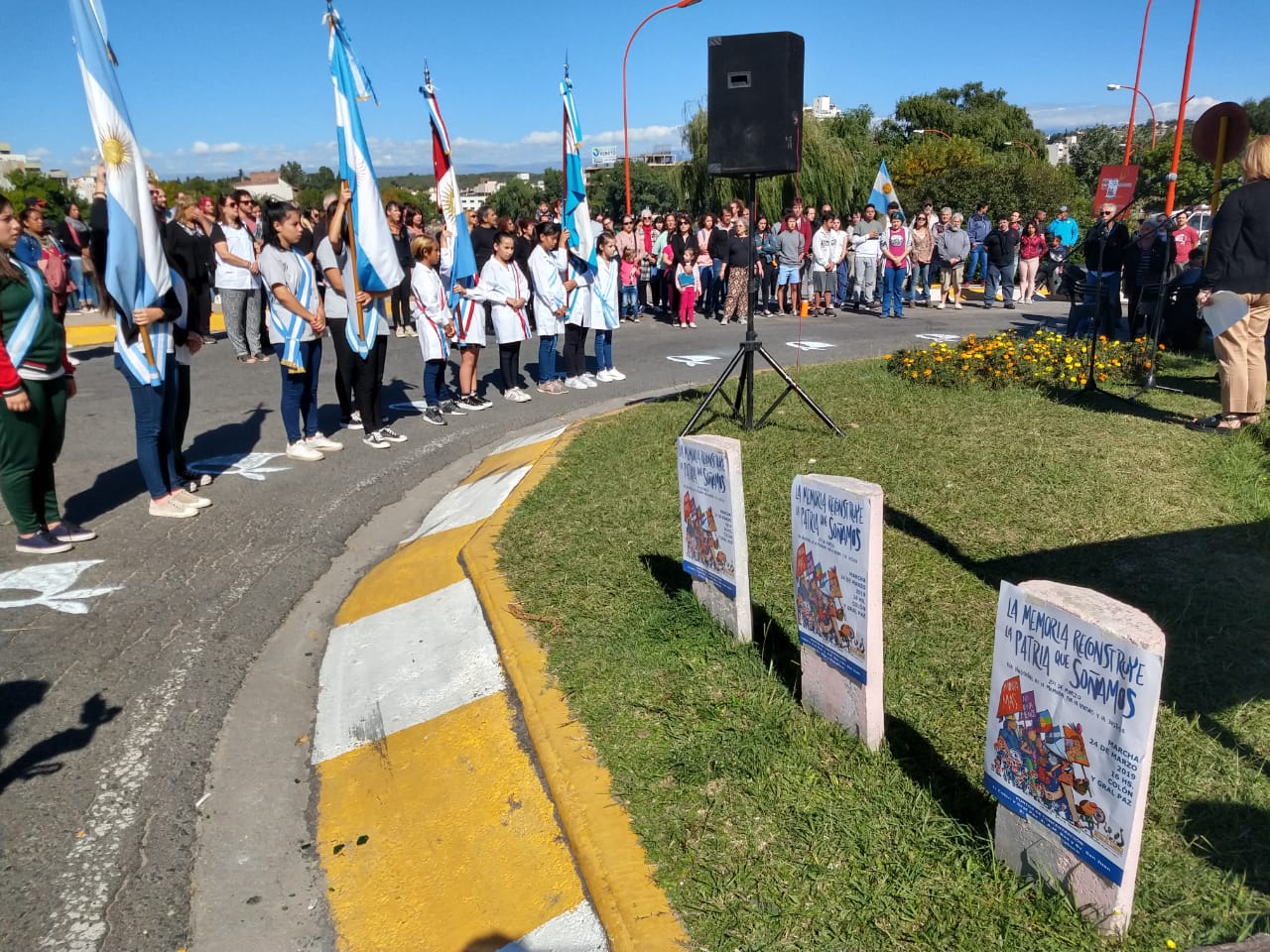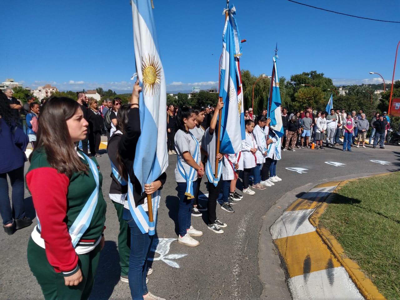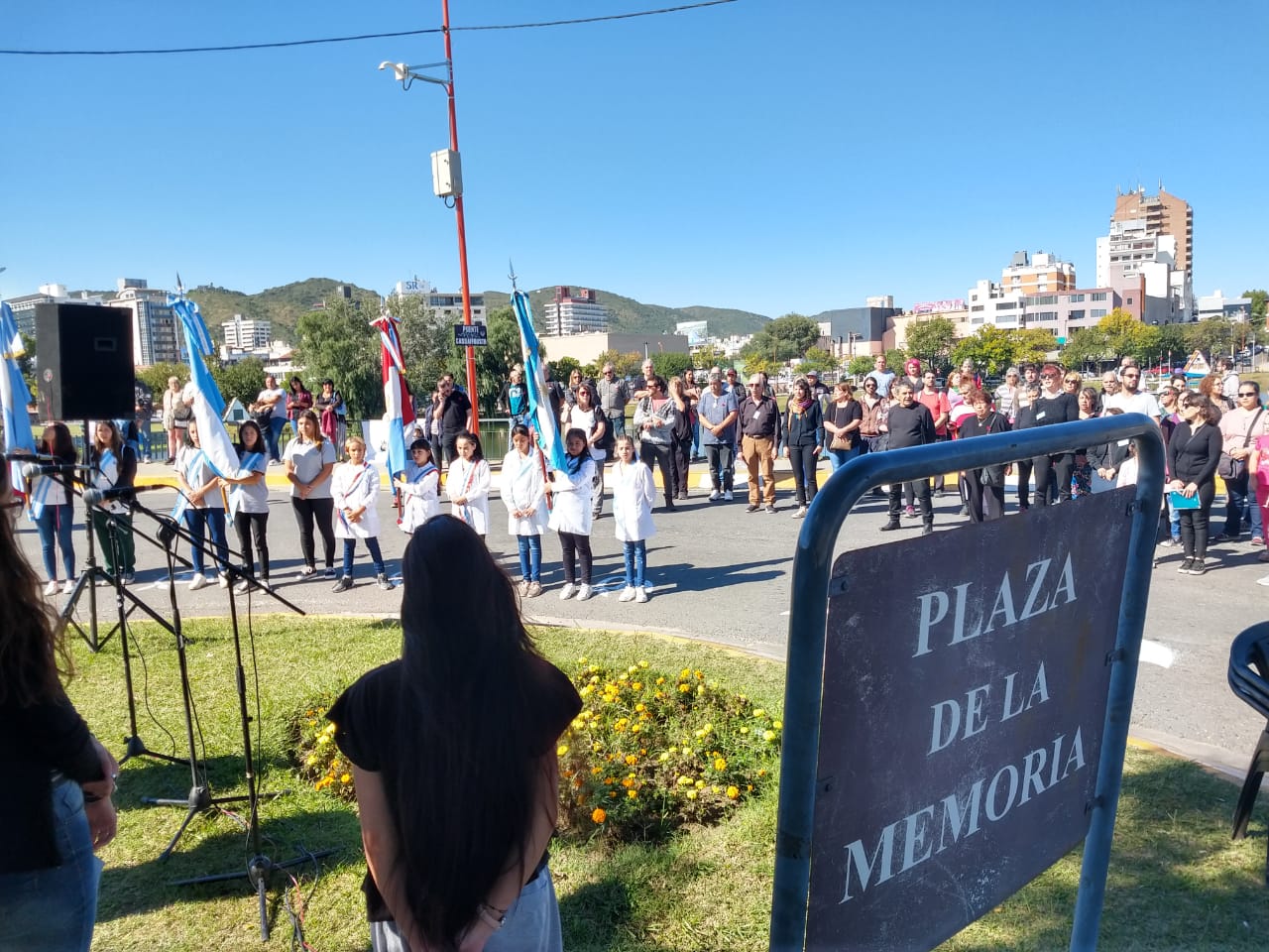 En la Plazoleta de la Memoria, los abanderados de las escuelas estuvieron presentes en la ceremonia. No hubo autoridades municipales y sí participó del acto la concejala Laura Orce.