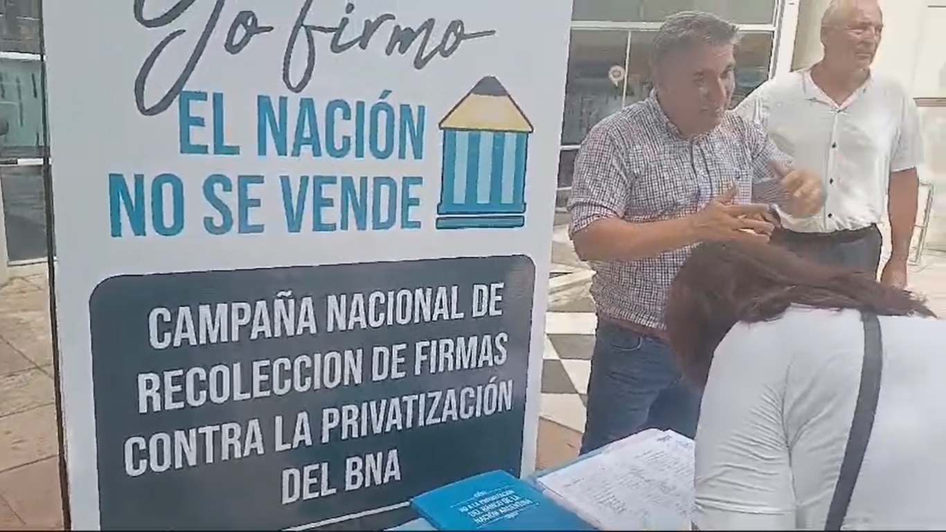 Empleados del Banco Nación y referentes provinciales de la Asociación Bancaria encabezaron una junta de firmas enfrente a la sucursal de Villa Carlos Paz de la entidad para plantear la oposición a su cierre.