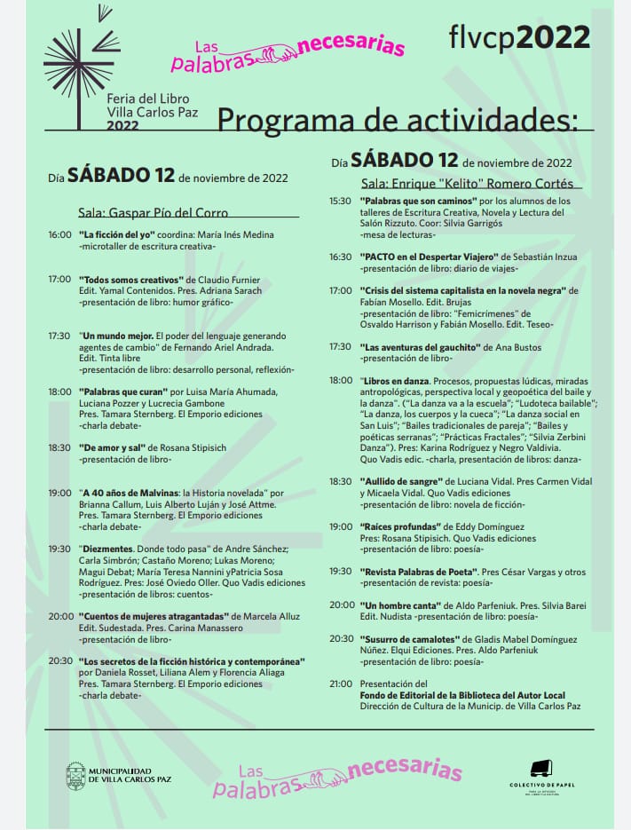 Otros autores invitados son la escritora local Rosana Stipisich que presentará su novela romántica “De amor y sal”, inspirada en el Mar de Ansenuza (Mar Chiquita, Córdoba) y el periodista Alexis Oliva, quien presentará el libro “La violencia nació conmigo”. Crónicas de vidas en conflicto.