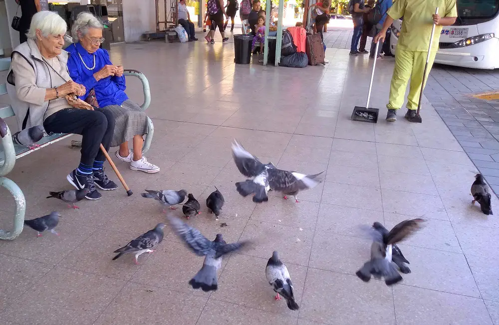 Primero vi el alboroto de palomas grises, blancas y manchadas. Su pelea por el pan de cada día estaba en plena ejecución. Después las vi a ellas. Olga y Zulema se llaman. Caminan todos los días desde el hogar en el que viven para celebrar la misma ceremonia. “Al pan me lo dan y venimos todos los días desde hace dos años”, me cuenta Olga con una sonrisa despierta y yo tengo ganas de abrazarla.
