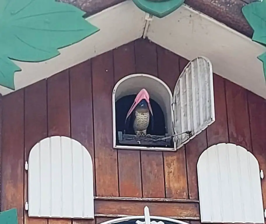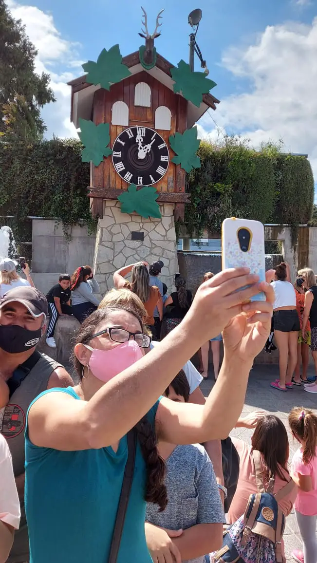 Luis Tórtolo, con su cámara inquieta, registró imágenes en la zona donde está anclado el Reloj Cu Cú, el ícono turístico de Carlos Paz, cuyo pajarraco aparece luciendo su barbijo para que los chicos y grandes sigan su ejemplo.