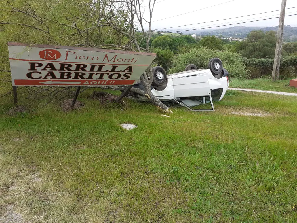 A la altura de la Parrilla Piero Monti, un automóvil Fiat Uno color blanco, por motivos que deberán establecerse, se despistó, volcó y terminó impactando contra el cartel del comercio antes mencionado.