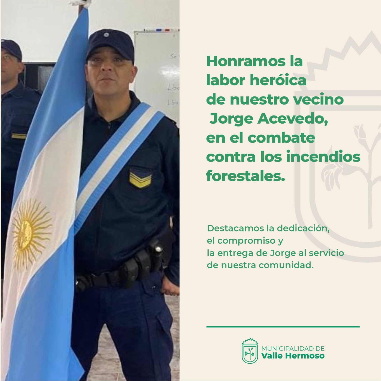 Desde la Municipalidad de Valle Hermoso expresaron un fuerte reconocimiento a la labor heróica de Jorge Acevedo, oficial de la Policía de Córdoba que en el combate contra los incendios forestales rescató a una mujer de las llamas.