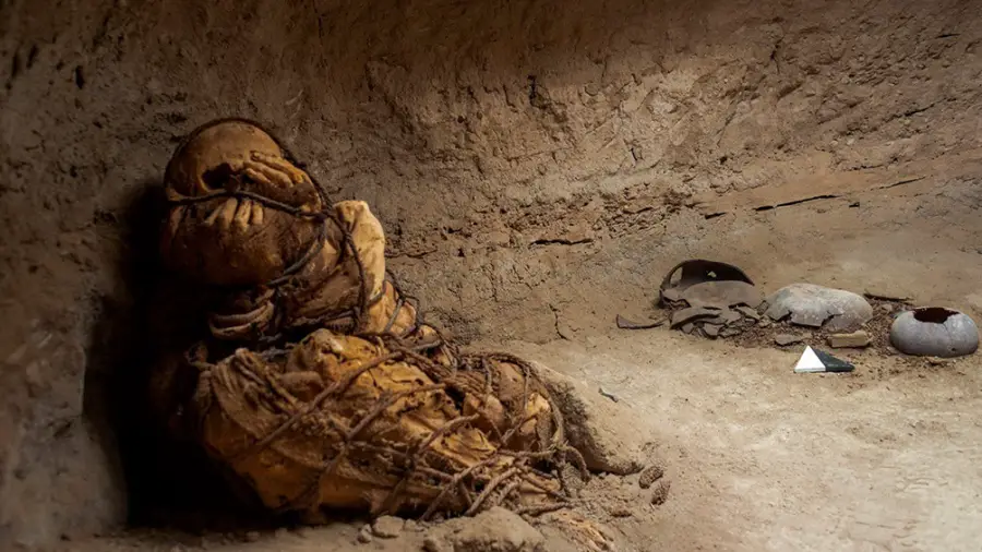El descubrimiento ocurrió dentro de una cámara funeraria de unos tres metros de largo y a una profundidad de 1,40 metros en el sitio arqueológico Cajamarquilla, al este de Lima.