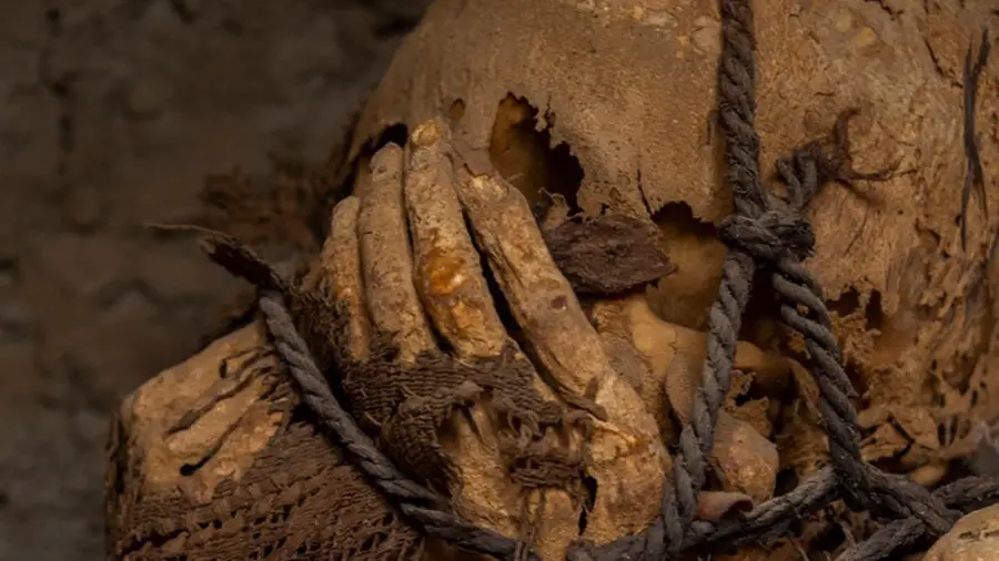 Arqueólogos peruanos hallaron una momia preincaica de entre 1.200 a 800 años de antigüedad atada con sogas mientras excavaban en un milenario complejo urbano de barro en la periferia de Lima.