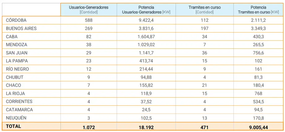 Es importante resaltar que nuestra provincia es la que aportó la mayor cantidad de usuarios generadores (588) y mayor potencia instalada a la red (9.422,4kW.), mientras que el segundo lugar lo ocupa la provincia de Buenos Aires con 269 usuarios generadores y 3.831,6 kW. En menor proporción se pueden mencionar a CABA y las provincias de Mendoza, San Juan, La Pampa, Río Negro y Chaco.