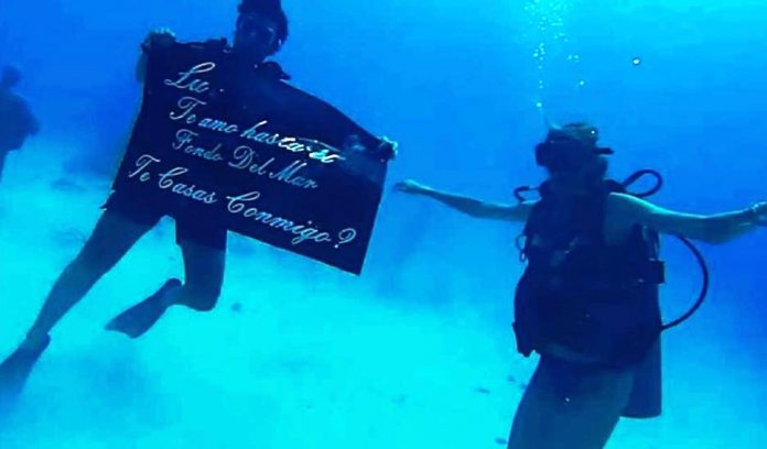 El futuro esposo tenía ideado el plan y, antes de viajar, había acudido a su hijo mayor, que es diseñador gráfico, para que lo ayudara con el banner que sumergió en las profundidades del mar.