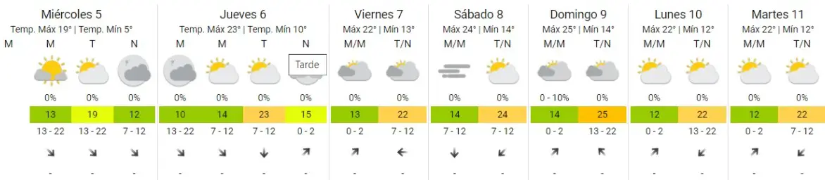 Todos con mínima de entre 14 y 15 grados y máximas de 22 a 25 grados. Sin dudas serán días para aprovechar.