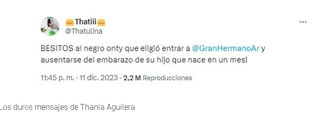 Luego de su entrada al reality, una joven llamada Thania Aguilera hizo una grave acusación contra el cordobés en las redes sociales. Ella aseguró que estaría esperando un hijo de Ontivero. Además, de acusarlo de no querer hacerse cargo del bebé, señaló que suexpareja sería una persona violenta. “Besitos al Negro Onty que eligió entrar a @GranHermanoAr y ausentarse del embarazo de su hijo que nace en un mes”, posteó Aguilera en su cuenta de la red X.