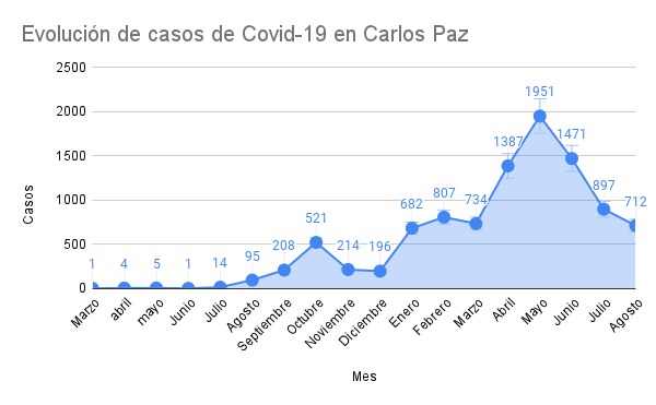 De esta manera, agosto cierra con 712 casos informados oficialmente, lo que representa una tasa diaria de 22.96 positivos. En tanto, en estos 31 días 13 personas perdieron la vida como consecuencia de haber contraído la enfermedad.