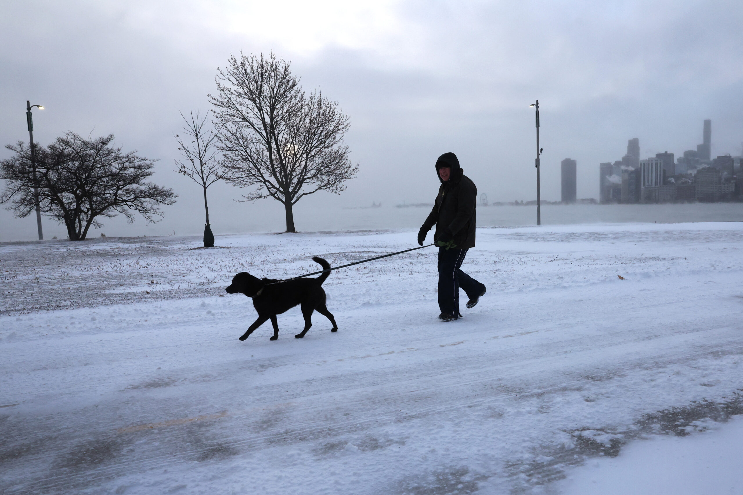 CHICAGO, ILLINOIS - DECEMBER 23: A man walks his dog along the lakefront near downtown as temperatures hover about -6 degrees on December 22, 2022 in Chicago, Illinois. Sub-zero temperatures are expected to grip the city for the next couple of days with wind chill temperature dipping as low as -40 degrees. Scott Olson/Getty Images/AFP (Photo by SCOTT OLSON / GETTY IMAGES NORTH AMERICA / Getty Images via AFP)