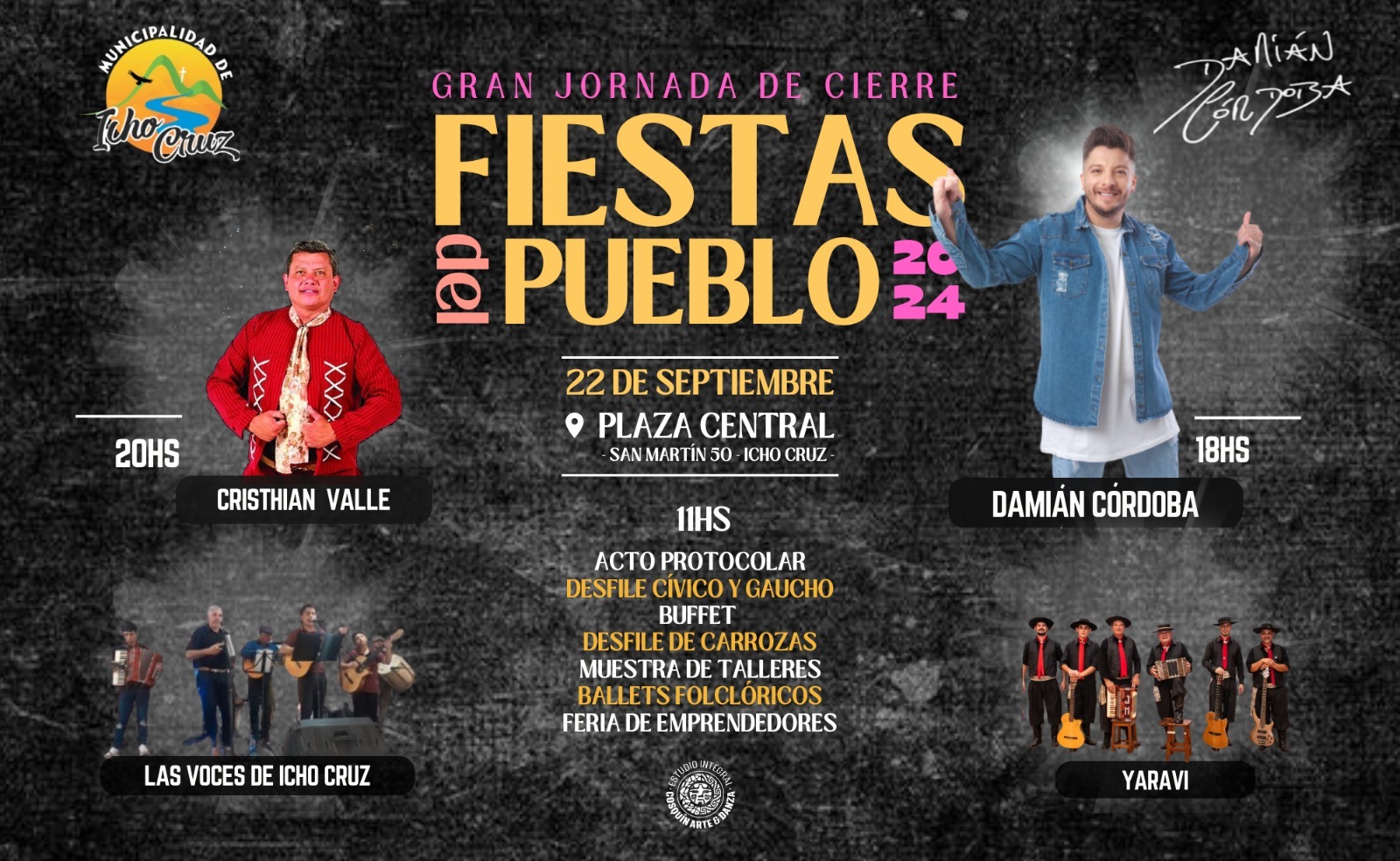 El gran atractivo musical de la noche llegará con la presentación de Damián Córdoba a las 18. El popular cantante de cuarteto es uno de los máximos referentes del género y, sin dudas, el público disfrutará de su carisma y energía sobre el escenario. Su presencia en el cierre de las Fiestas del Pueblo es una muestra del alto nivel de los artistas que forman parte de esta celebración.
