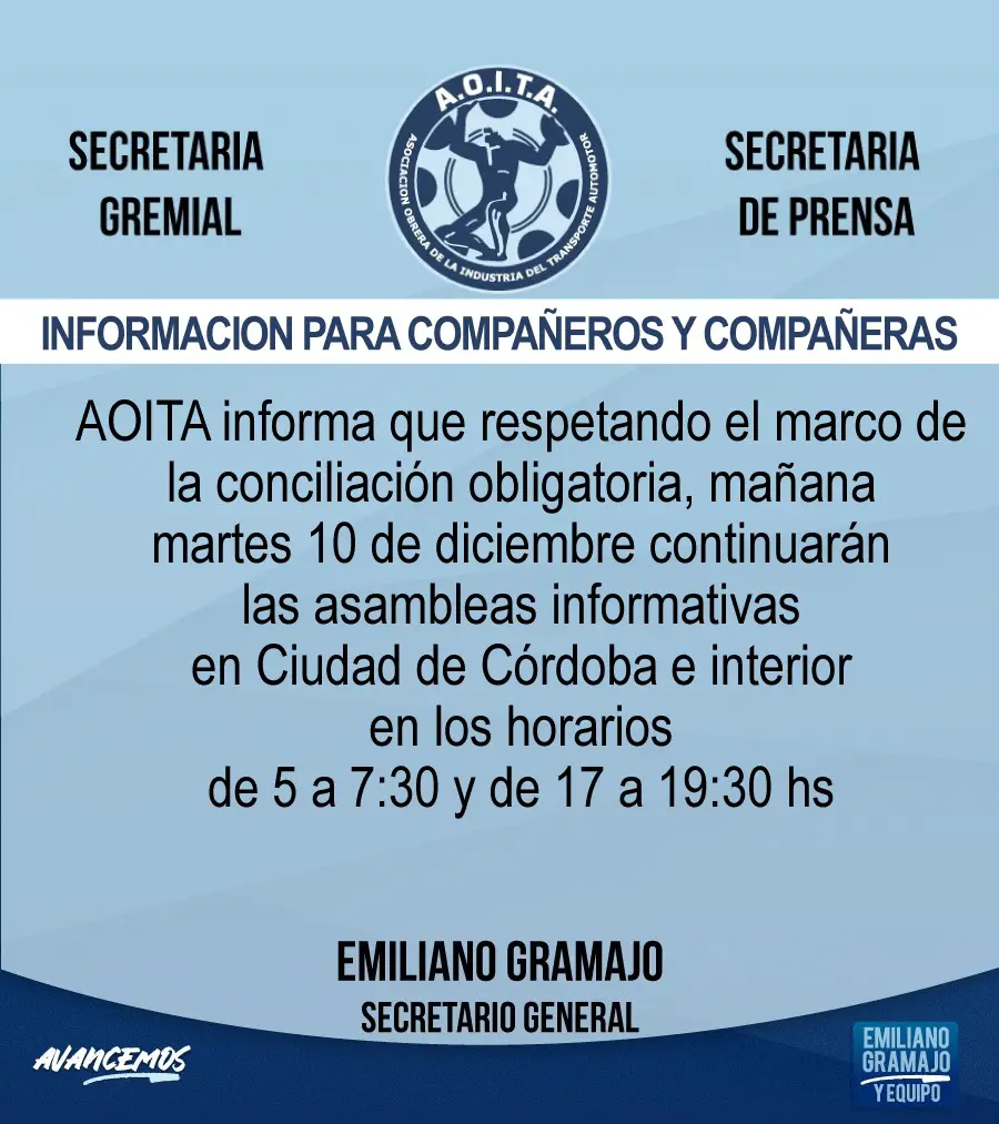 Desde la Asociación Obrera de la Industria del Transporte Automotor (Aoita) informaron que este martes habrá nuevas asambleas informativas que resentirán el servicio interurbano y el urbano en las localidades del interior provincial.