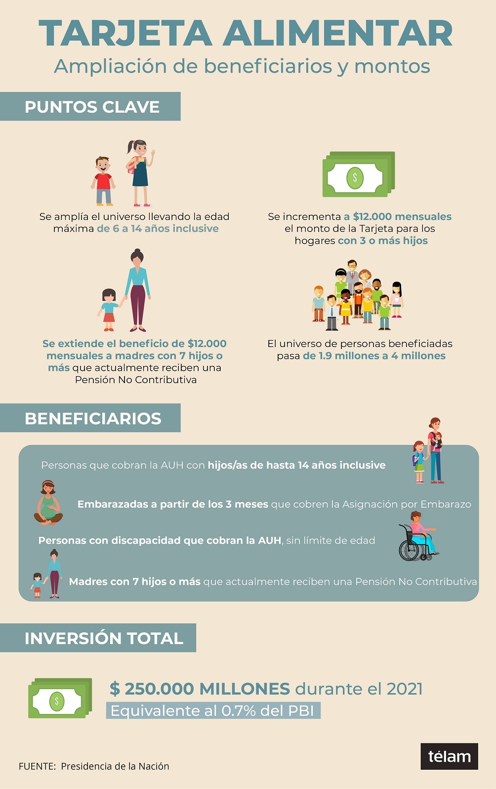 «Es automático y no hay que hacer trámites. Se va a convocar para entregarle la tarjeta desde el Banco Nación o Provincia. La tarjeta era para madres con chicos hasta 6 años y ahora pasa a ser hasta los 14 años inclusive«, agregó.