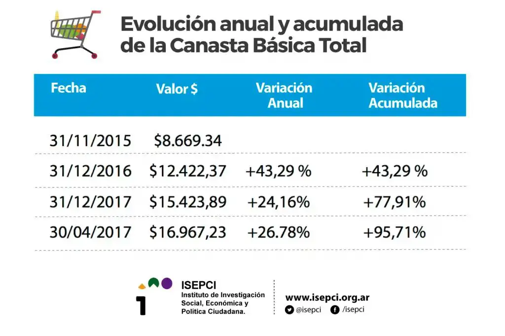 Un estudio del Isepci (Instituto de Investigación Social, Económica y Política Ciudadana) señala que la canasta básica aumentó un 95,7% desde el 31 de noviembre de 2015, una semana antes de la asunción de al nueva gestión de gobierno nacional.