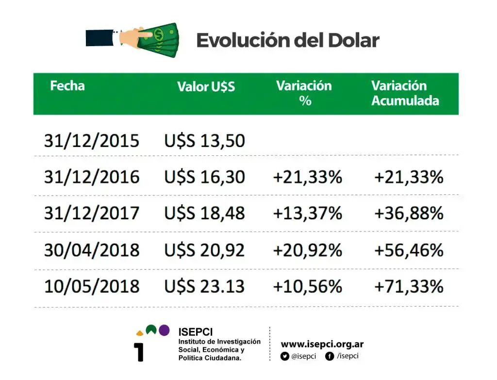 En el último día hábil de abril el dólar se cotizaba a $20,92 por unidad (+13,20% respecto a diciembre), llegando a llevando a +56,46% el avance de la divisa desde diciembre de 2015.