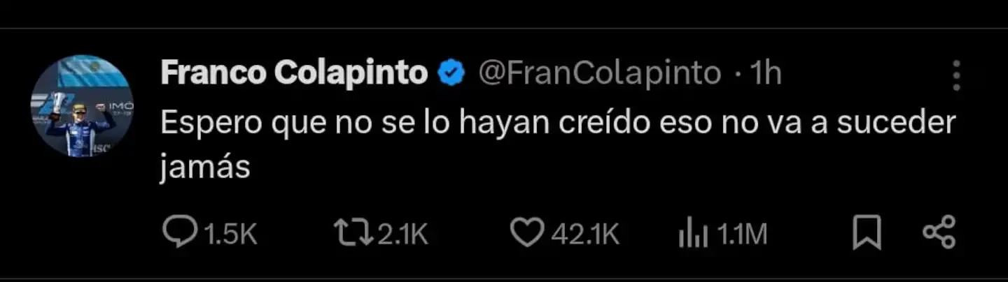 Sin embargo, pocos minutos después, Colapinto salió a aclarar que todo era una broma: “Espero que no se lo hayan creído, eso no va a suceder jamás”, escribió, devolviendo la calma a sus fans. Las respuestas no tardaron en llegar, entre comentarios de alivio y bromas sobre la situación. “No nos asustes así, bro, casi se me sale el corazón”, comentaba uno de sus seguidores, mientras otros lo comparaban humorísticamente con Lionel Messi, famoso por administrar personalmente su cuenta de Instagram.