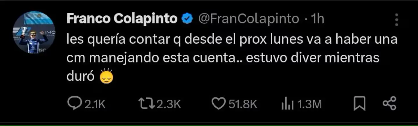“Les quería contar que desde el próximo lunes va a haber una CM manejando esta cuenta… estuvo divertido mientras duró”, escribió el piloto argentino de Formula 1, lo que desató una oleada de reacciones en cuestión de minutos. Sus seguidores, acostumbrados a su estilo espontáneo y descontracturado, expresaron rápidamente su descontento, temiendo que su ídolo contratara a un community manager que pusiera fin a la autenticidad de sus publicaciones.