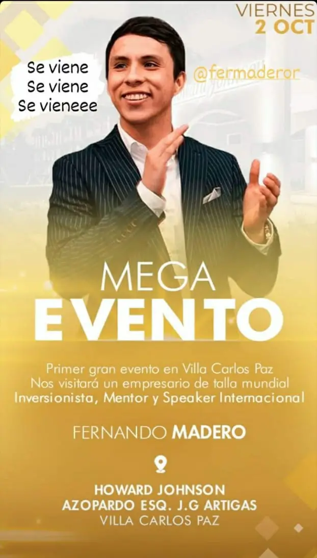 Continuando con lo que se promocionó en las redes sociales, lo cual se constató a partir de las publicaciones que, en las mismas redes, los asistentes realizaban sobre la ponencia, el disertante fue Fernando Madero, un joven y “empresario de talla mundial, inversionista, mentor y speaker internacional”.