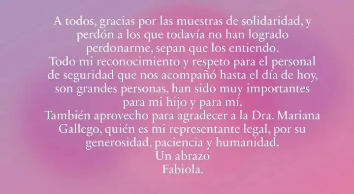 “A todos, gracias por las muestras de solidaridad, y perdón a los que todavía no han logrado perdonarme, sepan que los entiendo”, comenzó expresando Fabiola en un posteo que subió a su cuenta de Instagram.