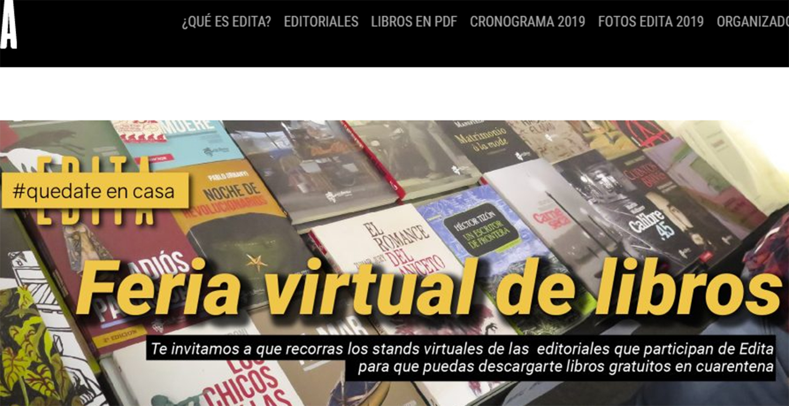 Edita es una feria virtual de libros que posibilita la descarga de ejemplares de manera gratuita en formato PDF. Se trata de una producción del colectivo Malisia, la Facultad de Artes de la Universidad Nacional de La Plata y el Centro de Arte de la UNLP.