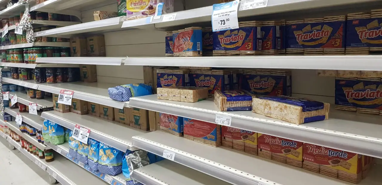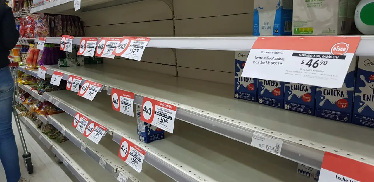 A las 21 de este sábado, las góndolas del supermercado Disco de la avenida San Martín se veían prácticamente vacías luego del aluvión de clientes que tuvo la sucursal durante todo el día.