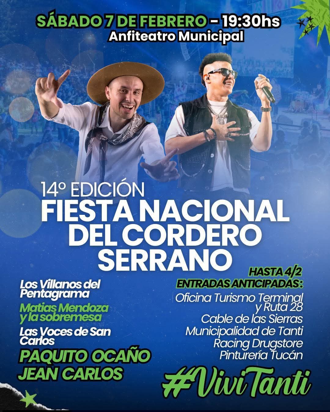 La localidad de Tanti se prepara para vivir una nueva edición de uno de sus clásicos más esperados del verano. Este sábado 7 de febrero se realizará la 14ª Fiesta Nacional del Cordero Serrano, un evento que combina identidad cultural, gastronomía típica y una potente grilla artística, y que cada año convoca a miles de vecinos y turistas en el Anfiteatro Municipal.