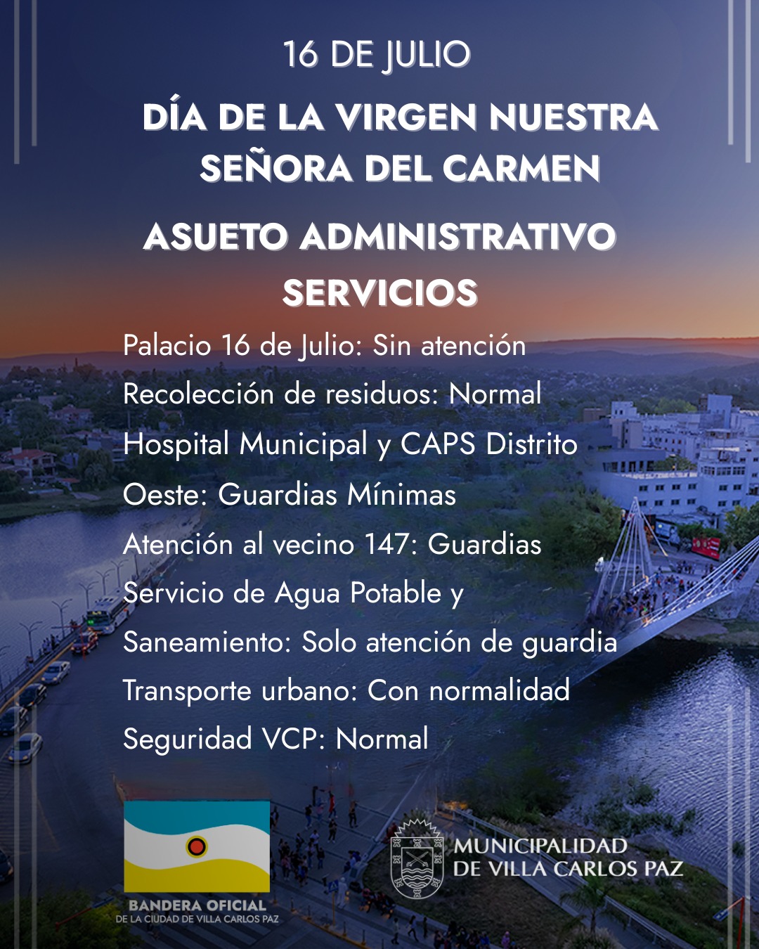 Este martes 16 de julio, Villa Carlos Paz conmemora el Día de la Virgen Nuestra Señora del Carmen, patrona de la ciudad, y en ese marco se dispuso asueto administrativo para todo el personal municipal.