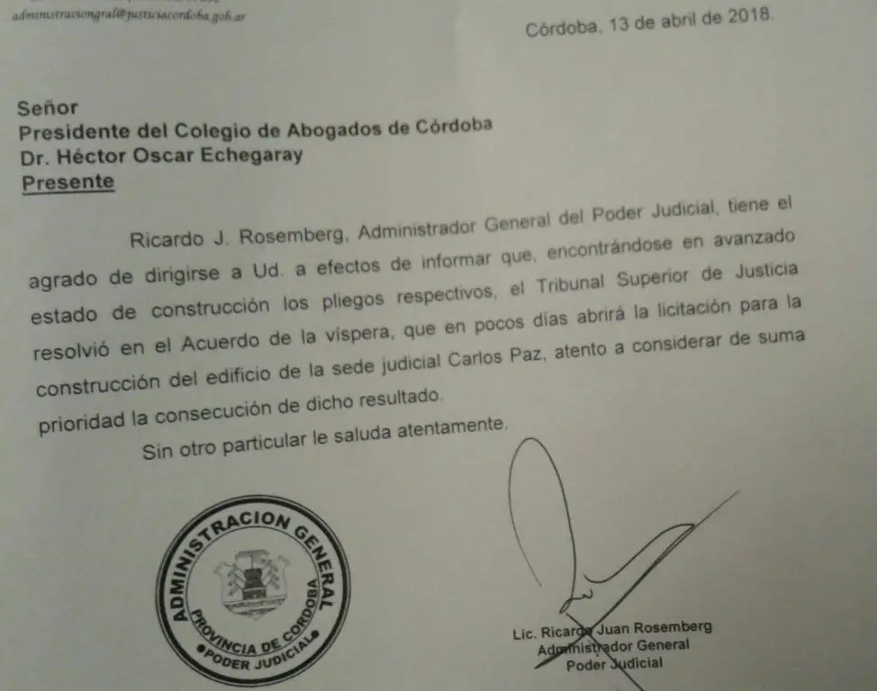 Este viernes, el Colegio de Abogados de Córdoba recibió una carta enviada por el Administrador General del Poder Judicial en la cual informa que “en pocos días se abrirá la licitación para la construcción del edificio de la sede judicial de Carlos Paz”.