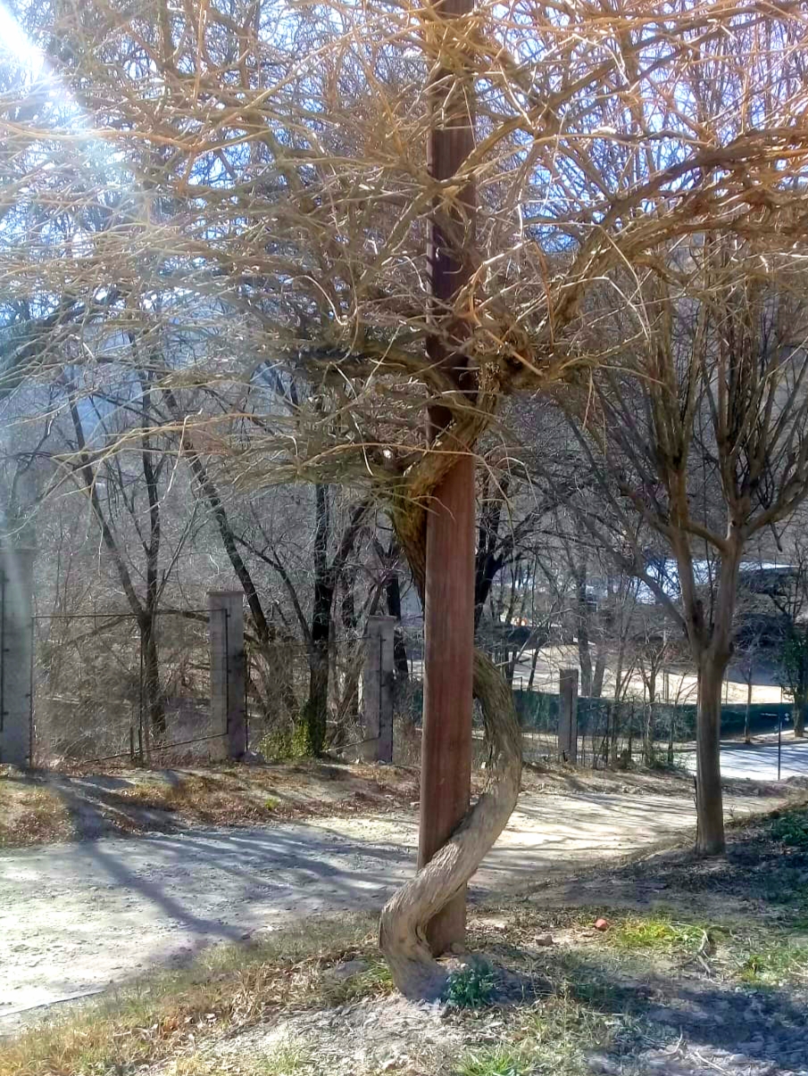 Pero en contrapartida, aquí nos ocupa un ‘firulete’ hermoso, artístico y sublime. El que le hizo este arbolito al poste, como queriendo abrazar un destino que los une en su desarrollo; natural el de uno, impuesto por la mano del hombre el otro.